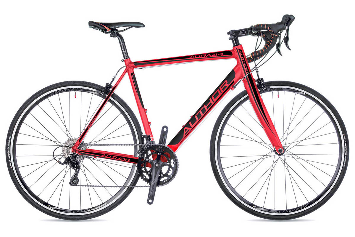 Author Aura 44 - шоссейный велосипед на оборудовании Shimano Tiagra c 2x10 передачами, алюминиевой рамой и частично карбоновой вилкой.